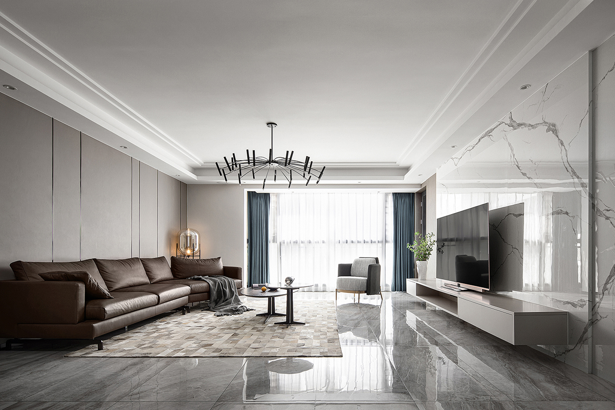 电视背景墙以大理石纹砖依次叠加并重组线条感为设计亮点。纹路自然延展、右侧恰好形成梯度线条,与定制的条形电视柜组合成立体的空间。